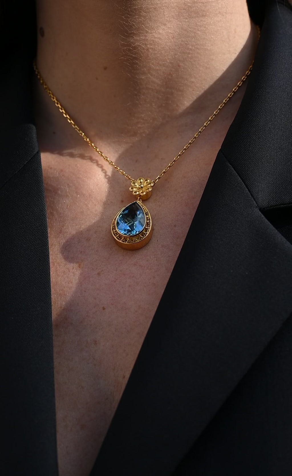 The Uranus pendant necklace takes its name from Οὐρανός, the ancient Greek word for sky and the primordial god who embodied the boundless heavens. Inspired by this celestial heritage, each pendant is meticulously handcrafted from 18K (750/1000) yellow gold and set with a pear-cut London blue topaz, whose deep, luminous hue evokes the infinite£ sky.